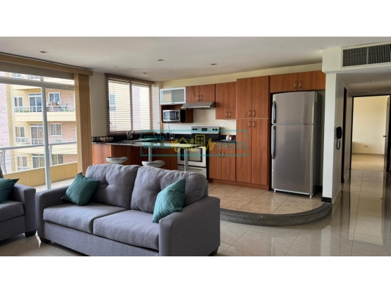 Tiene concepto abierto de cocina a sala y comedor, puertas corredizas a balcón, área de lavanderia, un cuarto secundario comparte un baño completo con el área social y el cuarto principal con su walk in closet y baño privado con jacuzi y ducha.